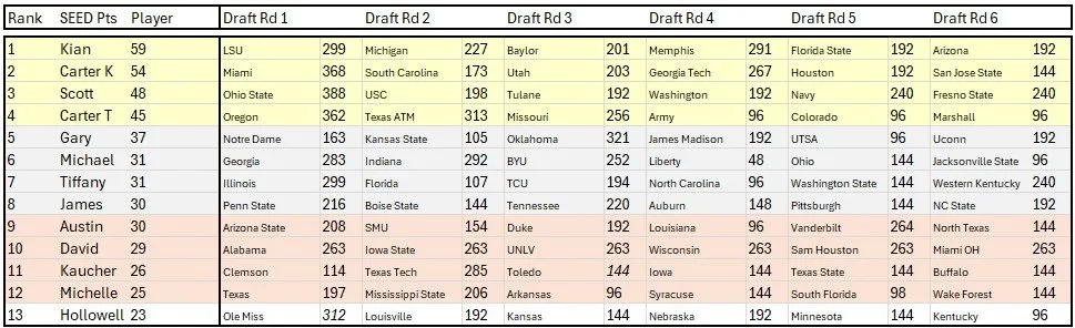 As noted, the weekly "seeding points" will flow into an end of year ranking. These rankings will sort the group into 3 groups (Gold, Silver and Bronze) for a double elimination knock out. Based on the 1st two weeks of the season, this is how things stack up. In case you were wondering, Ohio State is currently the most valuable team at 169 pts, followed by LSU at 158 pts and then Miami at 153 pts. Notre Dame holds the unique distinction of being the highest team drafted yet to post any points.