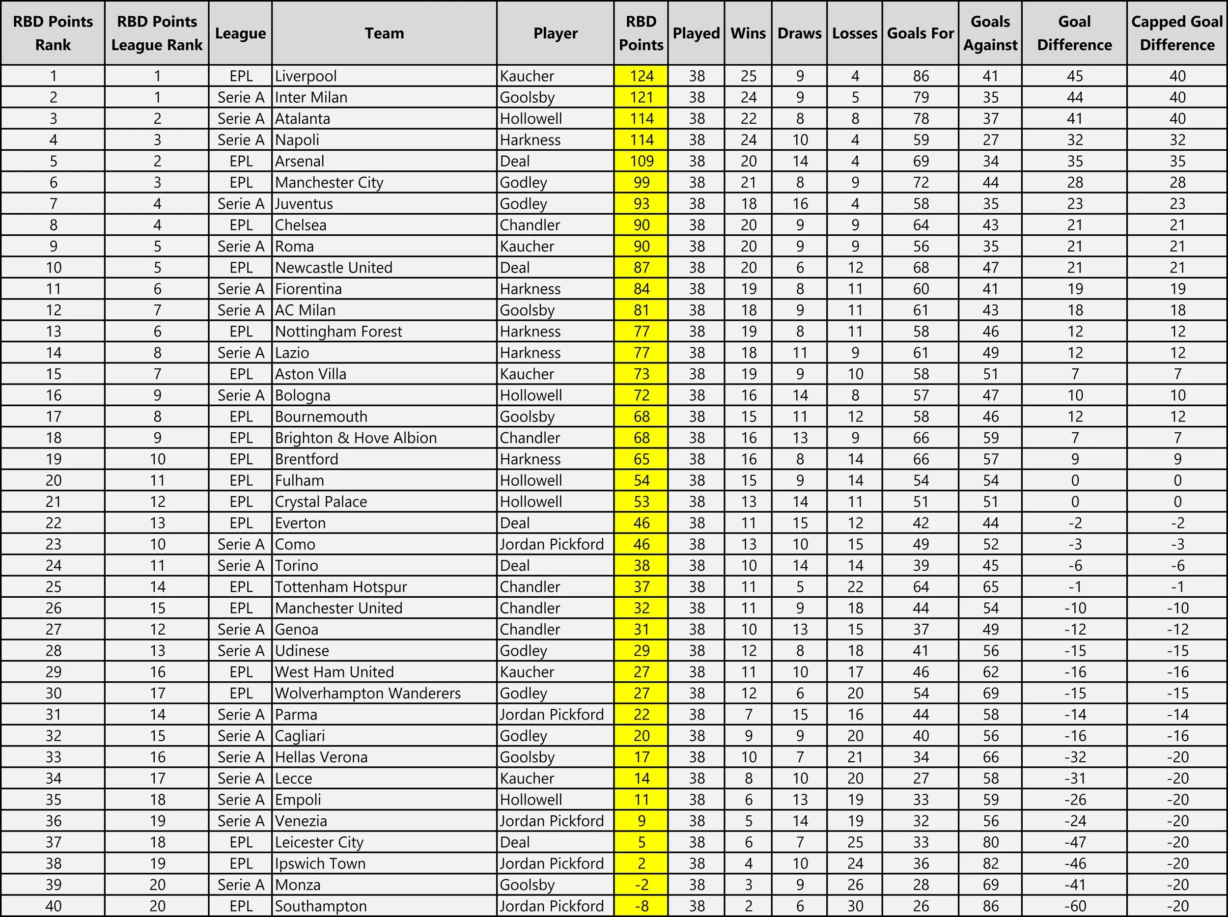 Thanks everyone for playing in the 4th season of our Premier League. Sorry that the weekly updates weren’t as interesting as in past years.